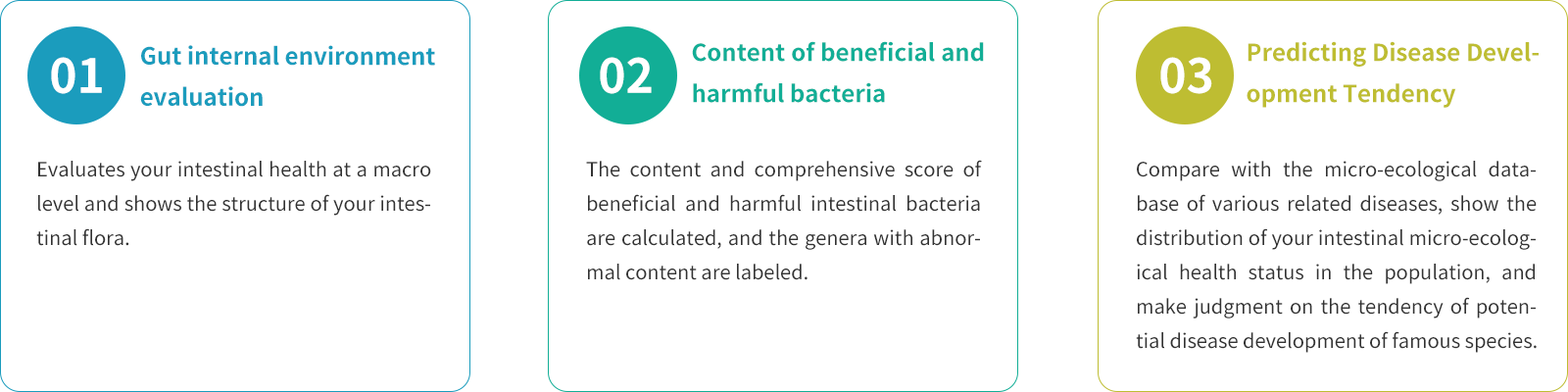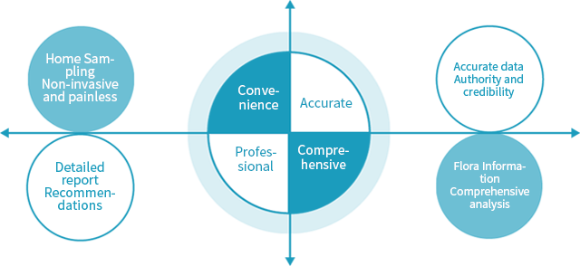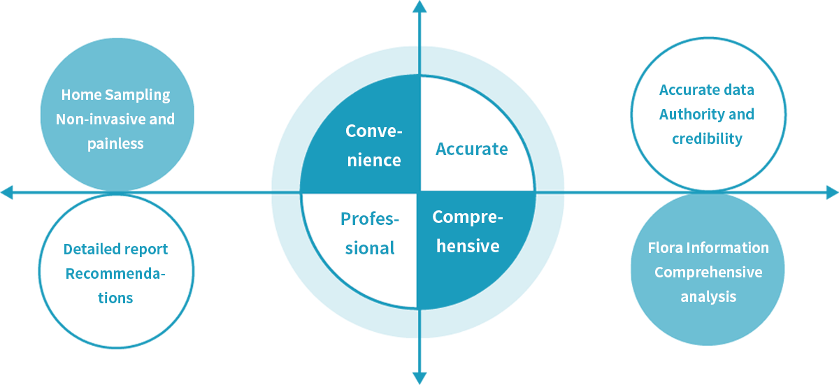 Using high-throughput sequencing technology, we can accurately and comprehensively obtain detailed information on the structure and relative abundance of the bacterial flora in fecal samples, and based on the information obtained, we can evaluate the internal environment of the intestinal tract, the content of beneficial and harmful bacteria, and the prediction of the tendency of disease development, etc., and make targeted recommendations for personal health management, which will help to take care of your intestinal health, keep away from diseases, and improve your quality of life.