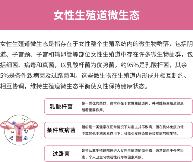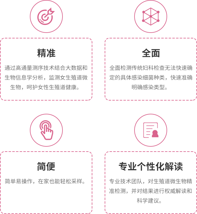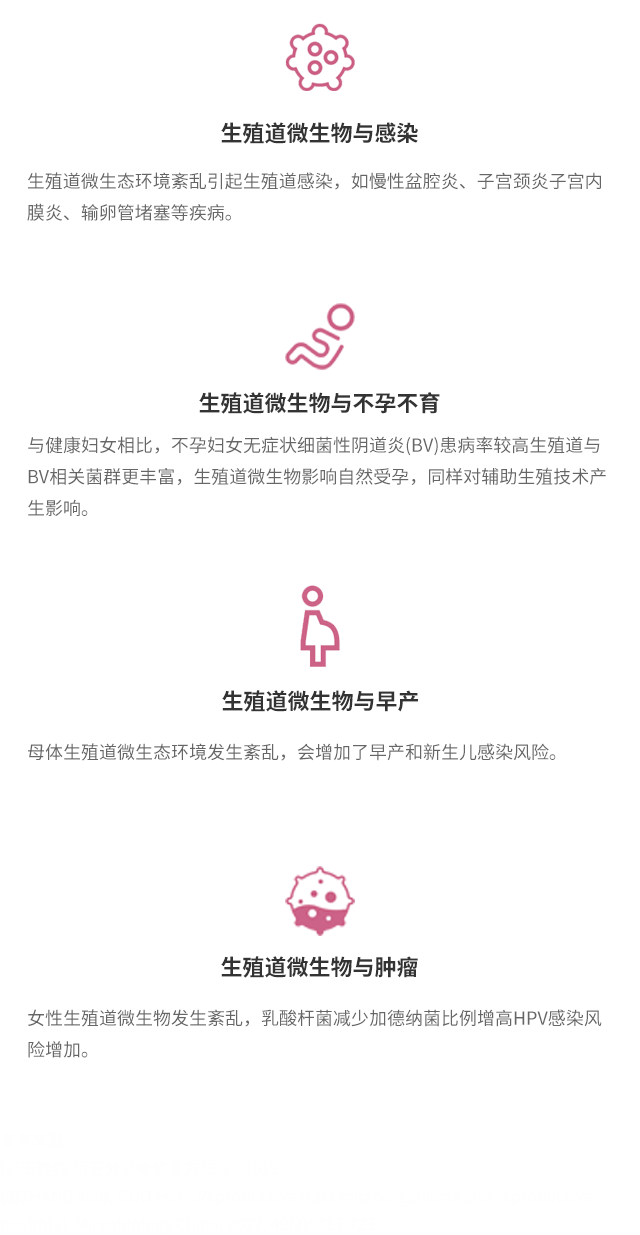 锐洁灵女性生殖道微生物检测服务产品 根据多年的数据积累和临床验证,通过二代高通量测序技术结合大数据和生物信息学分析,监测生殖道微生物菌群,帮助用户建立健康的生殖道微生态,呵护女性生殖道健康。 女性生殖道微生物与疾病[2] 产品优势 服务流程 适用人群