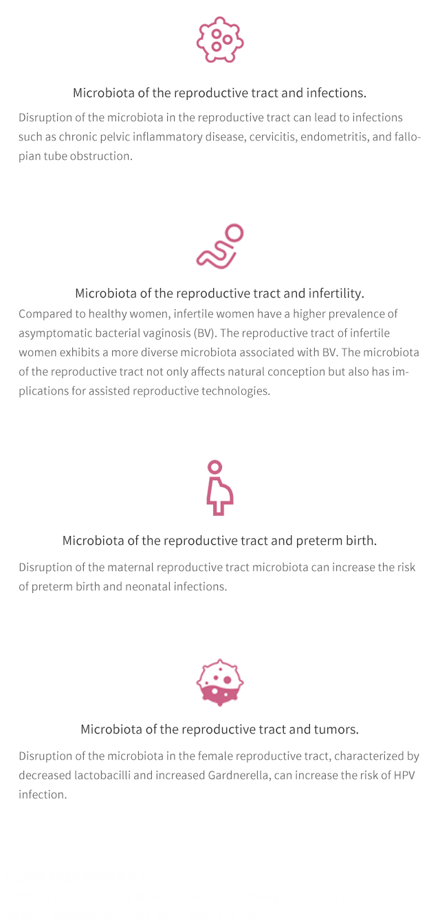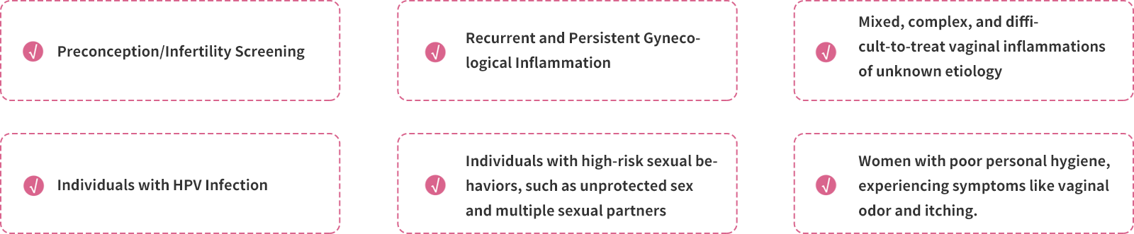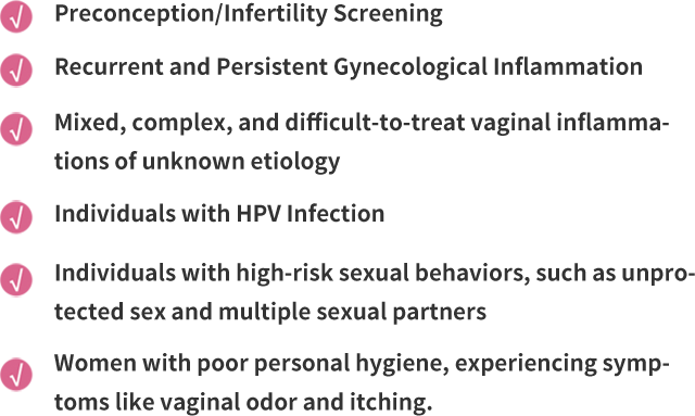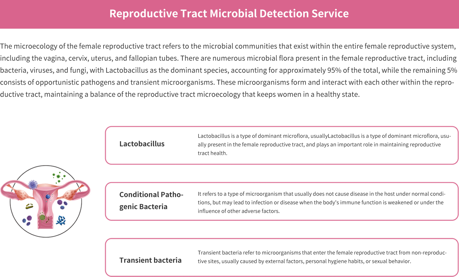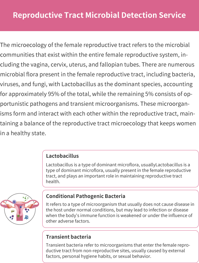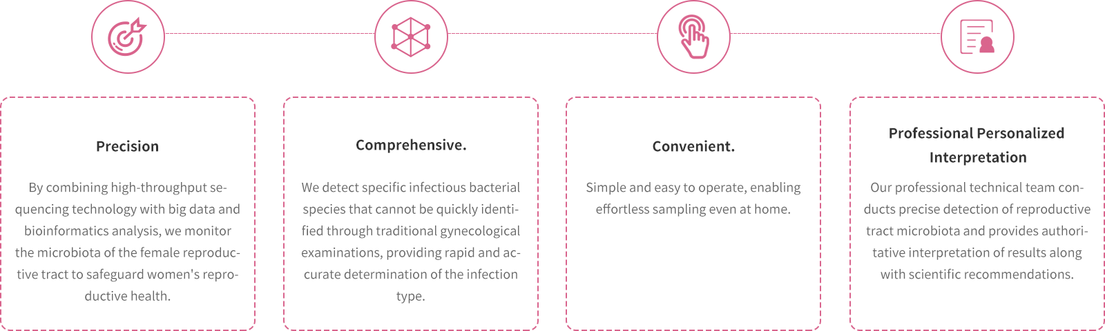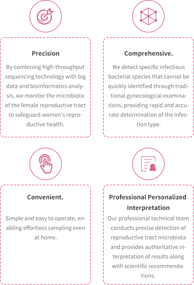 Based on years of data accumulation and clinical verification, through second-generation high-throughput sequencing technology combined with big data and bioinformatics analysis, the reproductive tract microbial flora is monitored to help users establish a healthy reproductive tract microecology and protect female reproductive tract health.