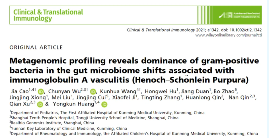 - 宏基因组分析揭示了与免疫球蛋白A血管炎相关的肠道微生物组变化中革兰氏阳性细菌的优势