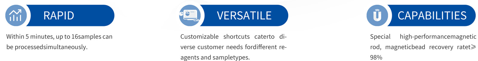 The REALMASTER L10 nucleic acid extractor adopts a purification method of magnetic rod adsorption and transfer of nucleic acid, while operating 1-16 samples to automatically separate and purify nucleic acids from various samples such as blood, exfoliated cells, saliva, urine, feces, etc. The instrument utilizes specially designed magnetic rods to adsorb, transfer, and release magnetic beads, thereby achieving the transfer of magnetic beads and nucleic acids and improving automation.