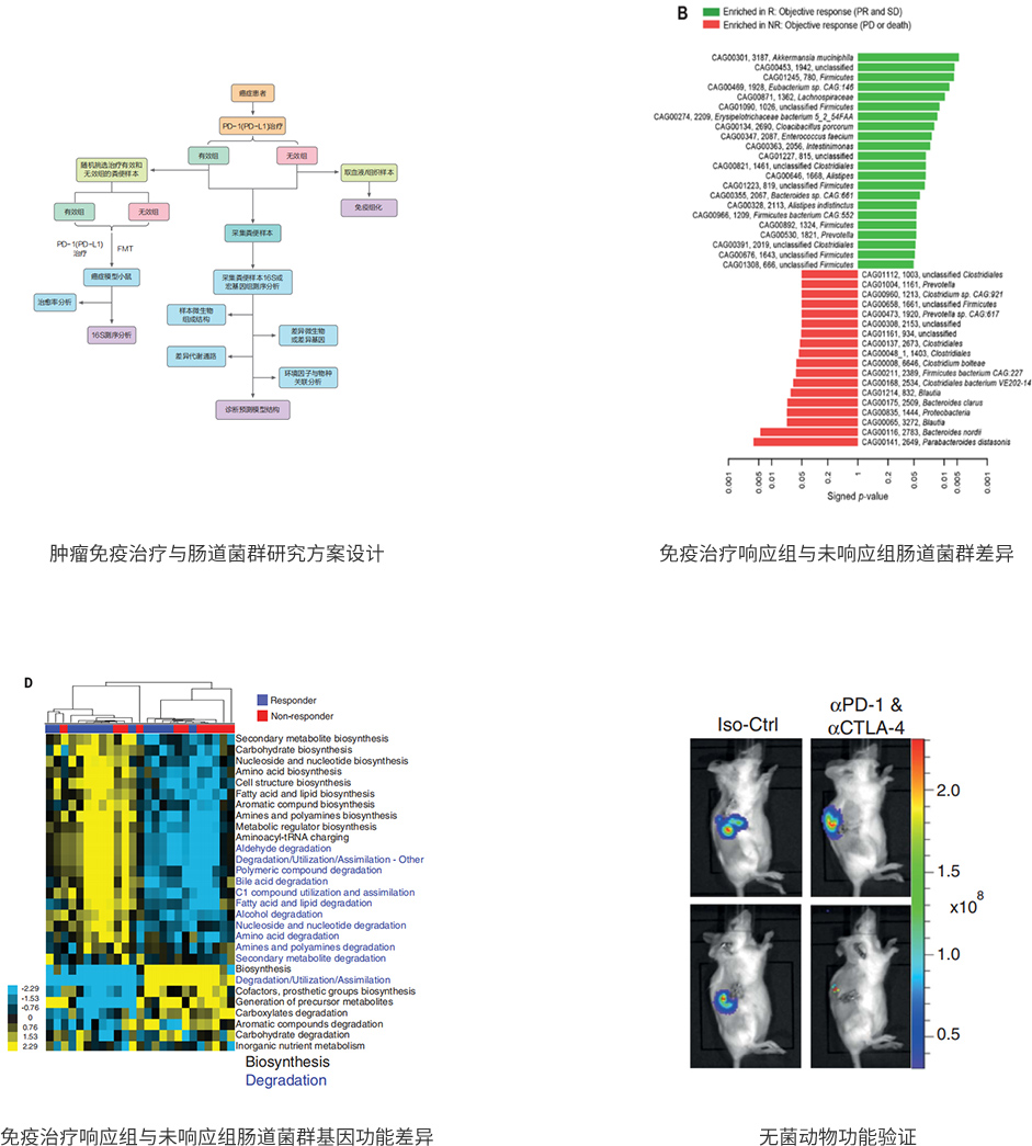 肿瘤免疫疗法是一种新兴的肿瘤治疗手段,主要是通过激发机体免疫系统,增强自身抗肿瘤免度力,从而控制和杀伤瘤细胞。《Science》杂志将其评为2013年“十大科学突破”之一。肠道是人体内的淋巴器官,存在超过70%的T细胞,是绝大多数记忆T细胞的居住地。肠道菌群可以通过直接物理接触、代谢产物以及肠道粘膜结构成分改变等多种机制与宿主免疫系统相互作用。2018年初,国际期刊《Science》杂志连发三篇重磅文章,聚焦肠道微生物对肿瘤免疫治疗的重要影响,证实在人体中肠道菌群会影响肿瘤免疫治疗的疗效。