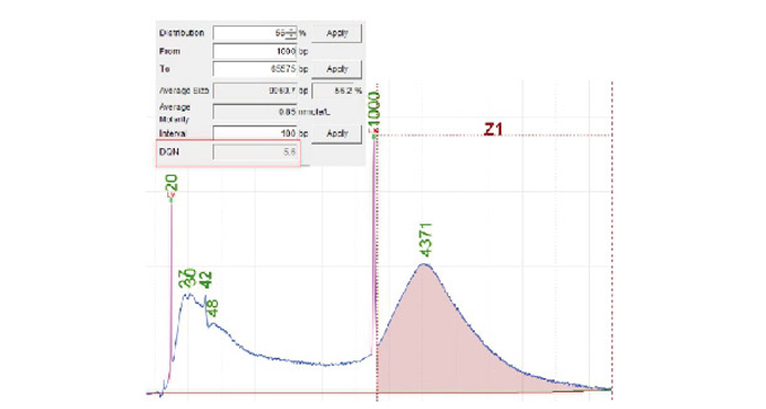 Qsep100生物分析仪以峰图展示了gDNA质量分析的结果,可以判断gDNA降解的情况。Qsep100特有的gDNA质量值(DQN:DNA Quality Number)可对每个gDNA样品的质量作出标准化评估