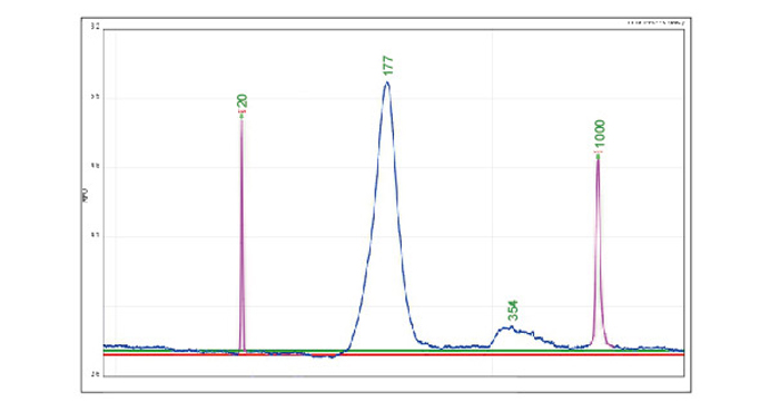 cf/ctDNA提取质量是决定后续质量的重要因素之一。上图为高敏 卡夹检测cfDNA样本结果,样本浓度为7pg/uL,结果显示主带明显且大小为177bp,符合预期