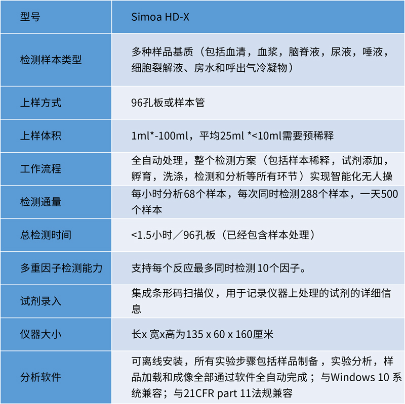 2014年底上市全自动超高灵敏度蛋白分子检测仪器Simoa HD-1 AnalyzerTM,2019年全面升级成Simoa HD-X AnalyzerTM。2017年10月,上市桌面型超高灵敏度蛋白分子检测仪器SR-X。目前拥有80多个相关配套试剂盒。Simoa是完全开放的平台,客户可以通过自己的抗体实现超高灵敏度蛋白标志物的检测和试剂盒的研究开发。