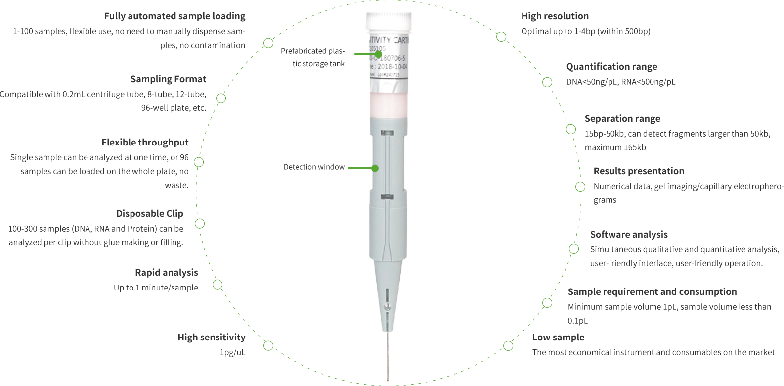● Sensitivity and resolution: 1pg/pl, 1-4bp (within 500bp)