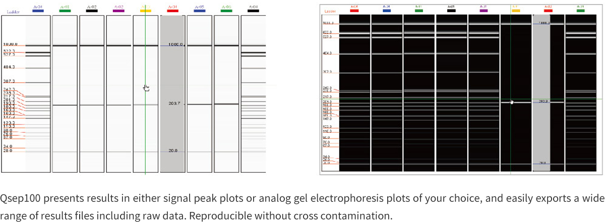 Qsep100Bioanalyzer integrates the tedious steps of traditional electrophoresis, such as sample preparation, reagent preparation, electrophoretic separation, signal detection and result interpretation, without the need for manual gel preparation, staining, sample addition, and photographing, and it is easy to operate, with automatic calculation of fragment size, and beautiful and easy-to-judge results. The technology adopts disposable pre-made gel clamps, which can directly detect and analyze the whole plate samples of 96-well plates, which greatly improves the work efficiency and significantly reduces the experimental cost.